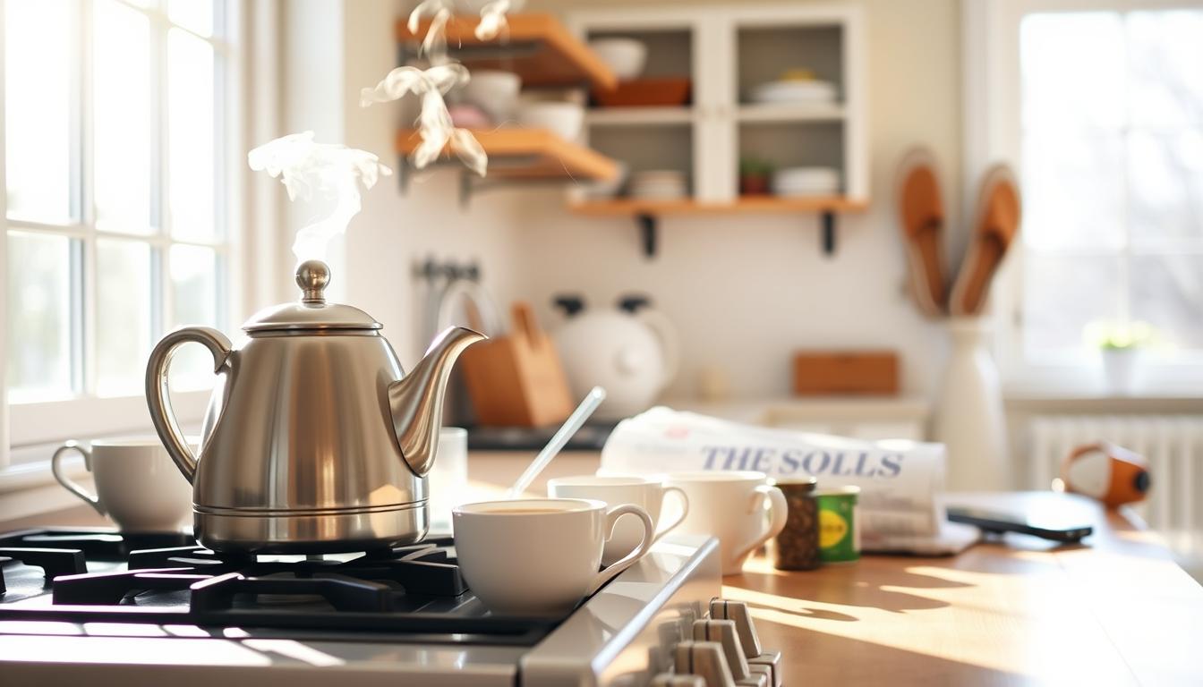 Boiling water for tea is more than just a whistle. It’s about mindful tea drinking, engaging all your senses. From hearing the kettle to watching steam rise, each moment is a chance to pause. These sensory moments turn daily tasks into mindful experiences.