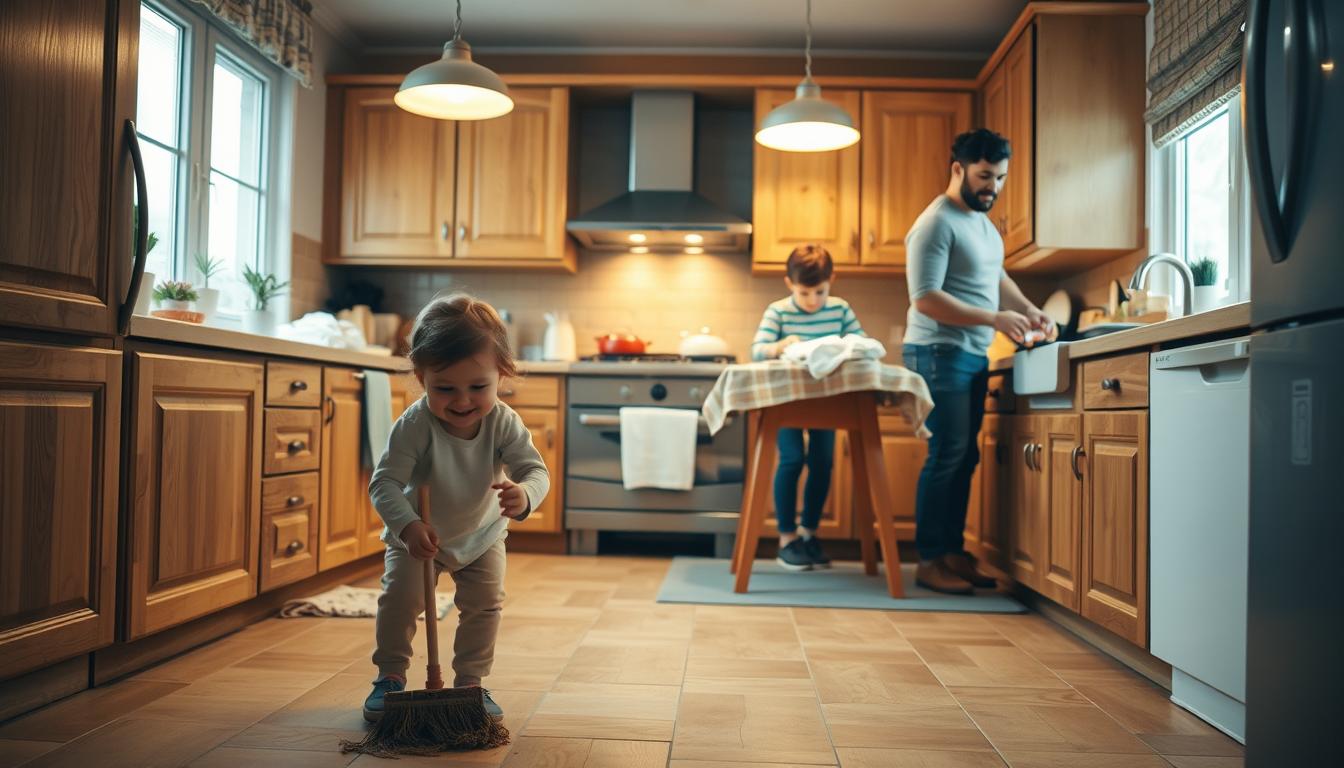Tasks for toddlers and teens help build responsibility. These tasks are more than cleaning. They’re chances to make family traditions. Doing things together, like setting the table or folding clothes, creates moments for talking, laughing, and feeling connected.