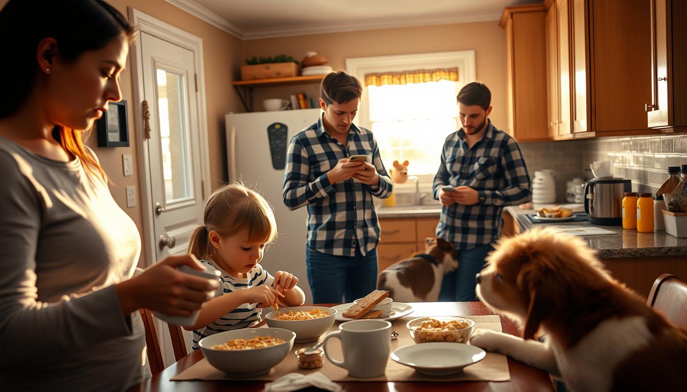 Family mornings can show the harmony or tension of the day. Simple tasks like packing lunches can cause stress, with 30% of families feeling tense. But, with remote work, parents have 10 extra minutes for breakfast, making mornings calmer.