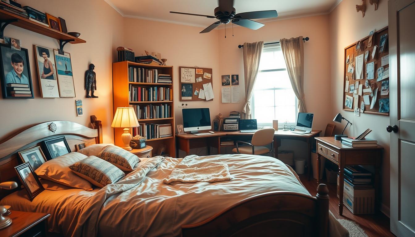 Changes in the family, like divorce or new siblings, change these spaces too. How a parent handles a messy room can be a fight or a chance to talk. Studies show 30% of adults go back to their childhood homes, looking for pieces of their past. These rooms are full of memories: a parent’s book, a sibling’s drawing. They show us that even our private spaces are filled with shared history.